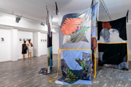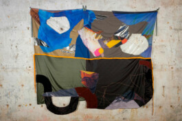 Lucia Veronesi, È successo il mare, 2020, tessuti, plastica, tessuti stampati, filo, cerniere, cinghie, fibbie, collages, dimensioni varie, vista dell’installazione, Fondazione Museo Pino Pascali, courtesy dell’artista, foto Marino Colucci