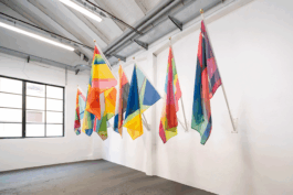 Matteo Negri, False Flags, 2023, tessuto nautico, acciacio, installazione, vista della mostra, Gate 44, Milano, foto Luca Casonato