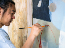 La pittura di Jingge Dong (Pechino, 1989) è caratterizzata dalla centralità del colore e da una figurazione accennata e onirica. Nelle sue tele episodi ispirati alla pittura classica orientale, basata sul disegno, si mescolano liberamente ad aree astratte occupate da campiture cromatiche uniformi delicatamente delineate. Ha esposto presso la Gallerie Triangle, Mosca, Fondazione Bevilacqua La Masa, Venezia, L’Ariete Artecontemporanea, Bologna, Museo Giovanni Fattori, Livorno, Rocca Malatestiana, Fano, Artcurial, Milano, Rave Residency, Trivignano, A plus A, Venezia. Ha vinto il Premio Mestre (2021) e il premio Ora (2018). Vive e lavora a Venezia.